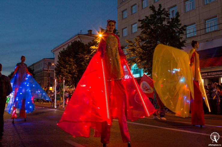 В очередной раз Воронеж отметил День России парадом уличных театров в рамках Платоновского фестиваля. Нынешний парад отличался от предыдущих тем, что начался не днем, как раньше, а в 21.00, когда над городом уже сгущались сумерки. В этот вечер для воронежцев делали шоу 11 ярких коллективов из России, Нидерландов, Германии, Франции, Великобритании.