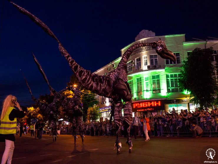 Началось шествие, по традиции, у памятника Андрею Платонову и продлилось до площади Ленина, где участники парада дали несколько представлений. Зрители, как завороженные, смотрели на светящиеся фигуры - тройку воздушных белых лошадей, гигантских динозавров и людей в светодиодных костюмах.