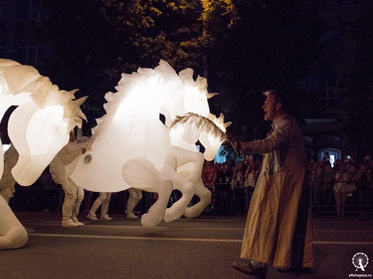 «Гордая лошадь» от французской компании Quidams. Авторы шоу Хол Колломб, Жан-Батист Дюпре и Жеральдин Клеман будто вернули зрителей в их детские сны. Действия сменялись одно другим, и главное было - уследить за всеми, чтобы не проснуться! Сначала шли венецианцы в белых костюмах. Несколько мгновений - и перед нами уже не люди, а белые светящиеся лошади, которым управляет сказочный кукольник. Сказочная вереница белых лошадей плыла по проспекту Революции под восторги зрителей.