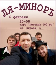 Завтра, 6 февраля, в клубе «Легенда 100ру» состоится концерт питерской группы «Ля миноръ». Жанр, в котором работает коллектив, сами музыканты преподносят как городской романс или chanson. Французское написание не случайно: эта музыка сильно отличается от того, что мы привыкли именовать «шансоном». Группа исполняет песни из репертуара Леонида Утесова, Аркадия Северного, Алексея Димитриевича и других, а также городской фольклор и собственные сочинения. В послужном списке коллектива множественные гастроли по странам Европы, а также выступления на Каннском и Венецианском кинофестивалях.