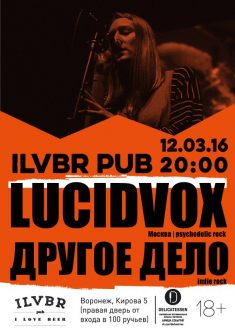 12 марта в пабе ILVBR выступит группа из Москвы LUCIDVOX, состоящая из 4 девушек, которые совмещают в своей музыке черты шугейза, краут-рока, постпанка и русского фольклора и называют весь этот коктейль психоделическим роком. Авторитетные музыкальные издания неоднократно называли коллектив самой многообещающей молодой группой на отечественной инди-сцене. Также в концерте примет участие воронежская команда «Другое дело».