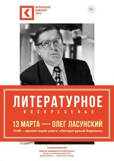 13 марта в Театральном клубе Камерного театра в рамках проекта «Литературное воскресенье» состоится презентация книги «Литературный Воронеж» писателя и краеведа Олега Ласунского. Ласунский - автор глубоких, основанных на богатом фактическом материале, исследовательских работ, многочисленных научно-популярных статей, очерков, эссе в российской, зарубежной и воронежской периодике. Заголовки его работ говорят сами за себя - «Литературная прогулка по Воронежу», «Воронежское дворянство в лицах и судьбах», «Житель родного города», «Записки старого пешехода», «Власть книги». По инициативе Ласунского в Воронеже были установлены памятники Андрею Платонову и Осипу Мандельштаму.